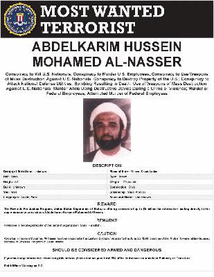 The Rewards For Justice Program, United States Department of State, is offering a reward of up to $5 million for information leading directly to the apprehension or conviction of Abdelkarim Hussein Mohamed Al-Nasser.