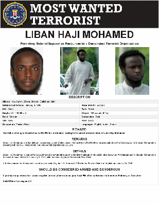Liban Haji Mohamed is wanted for allegedly providing material support to Harakat Shabaab Al-Mujahidin, also known as Al-Shabaab and Al-Qaeda. Mohamed is believed to have left the U.S. on July 5, 2012, with the intent to join Al-Shabaab in East Africa.