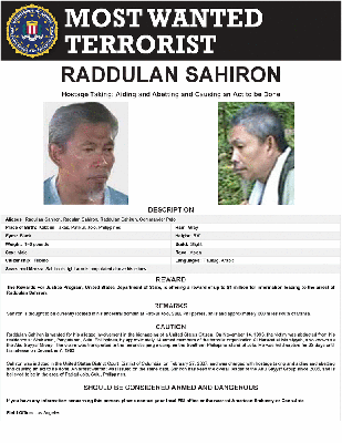 Raddulan Sahiron is wanted for his alleged involvement in the kidnapping of a United States Citizen. On November 14, 1993, the victim was abducted from his residence at Simbahan, Pangutaran, Sulu, Philippines, by approximately 14 armed members of the terrorist organization Al Harakat al Islamiyyah, also known as the Abu Sayyaf Group. The victim was transported to the terrorist's jungle camp on the Southern Philippine island of Jolo. He was held captive for 23 days until his release on December 7, 1993.