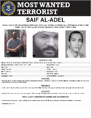 The Rewards For Justice Program, United States Department of State, is offering a reward of up to $10 million for information leading directly to the apprehension or conviction of Saif Al-Adel.
