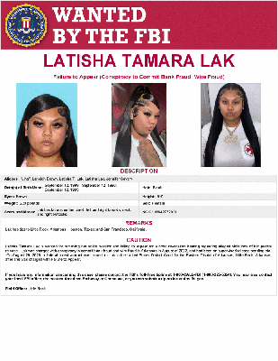 Latisha Tamara Lak is wanted for removing her ankle monitor and failing to appear for a bond revocation hearing regarding alleged violations of her pretrial release. Lak was charged with conspiracy to commit bank fraud and wire fraud in Arkansas in August of 2022, and had been on supervised release pending trial. On August 29, 2025, a federal arrest warrant was issued for Lak in the United States District Court for the Eastern District of Arkansas, Little Rock, Arkansas, after she was charged with Failure to Appear.